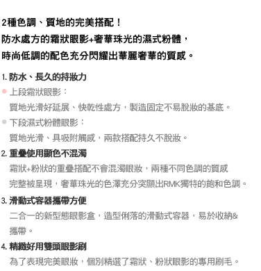 眼妝暈染、掉色總是讓女性感到困擾,使用RMK塵光眼影盒能夠達到長時間的持妝效果,就算是出汗也能夠保持美美的眼妝;RMK使用清水與卸妝液來實驗持色度,發現以水完全無法擦拭掉眼影,若使用眼唇卸妝液則能夠完全地卸除乾淨。