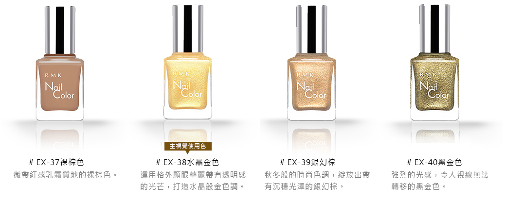 適合搭配秋冬主題彩妝的絕色指甲油新4色。 協調般的紅感與乳霜質感讓手部肌膚看起來更完美的裸棕色。擁有透明感的金色,妝點出如同水晶般的金色。綻放沉穩光澤的時尚銀幻棕色調。擁有迷人光芒的黑金色調令人視線無法轉移。連指尖也充分展現各種金色色調的魅力。