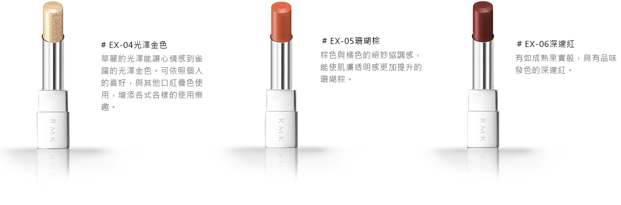 在唇部溶化後觸感有如唇蜜般的光澤,能賦予潤澤感的經典誘色口紅(潤采)。秋冬不可獲缺的3色全新登場。透明中閃耀出亮片感,金色光芒將雙唇包圍的光澤金。絕妙發色度的橘色調使肌膚看起來更明亮且突顯出透明感的珊瑚棕。帶有深邃感發色,醞釀出時尚品味氛圍的深邃紅。輕輕一抹散發出光滑質感且微透著光澤金,立即讓雙唇沉醉在金色韻味當中。
